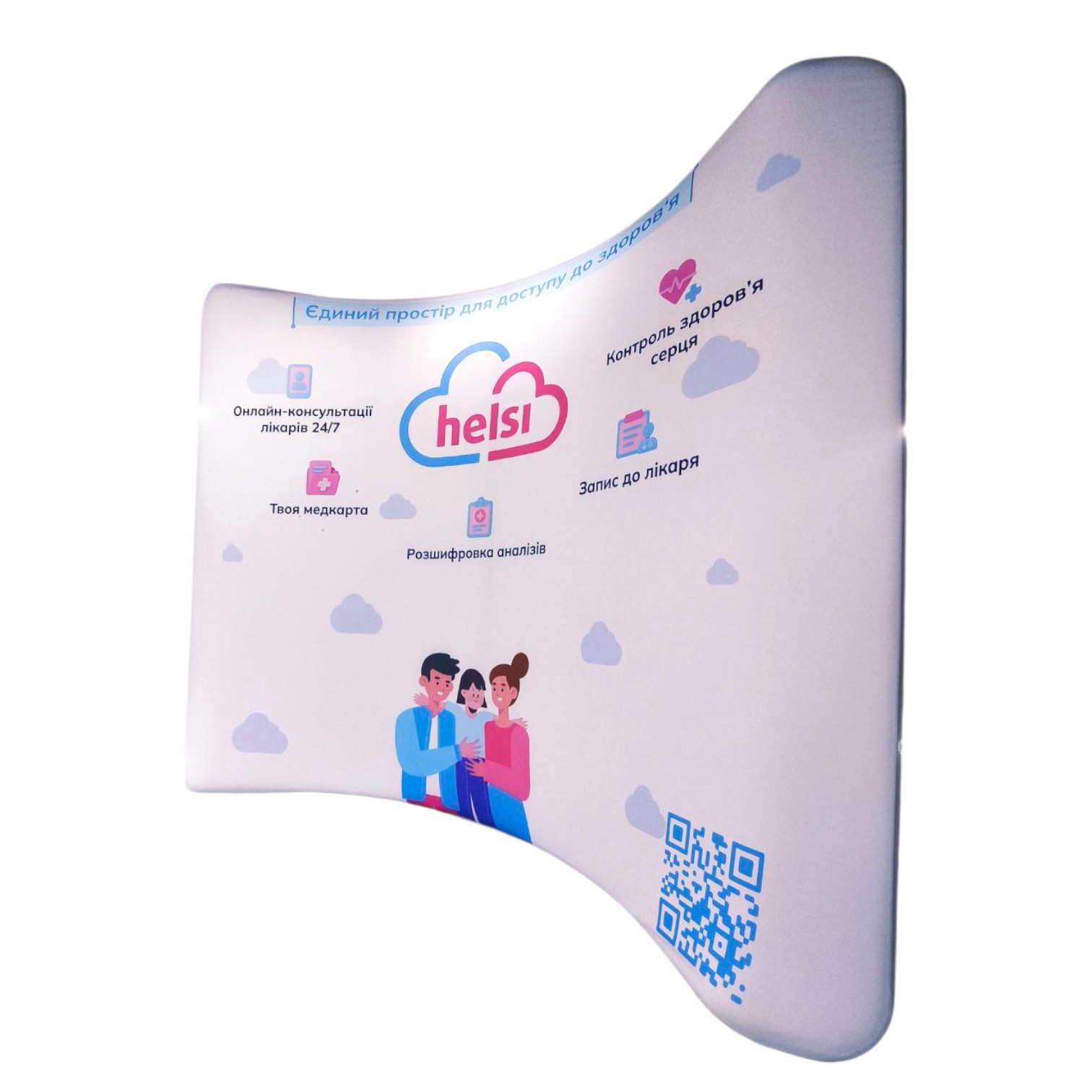 Графічне полотно з еластичної тканини вже закріплене на рамі за допомогою блискавки, тому під час розкладання стенду зображення автоматично натягується, утворюючи ідеально рівну поверхню без зморшок і складок. Вигнута форма конструкції підсилює візуальний ефект і робить стенд більш помітним у виставковому просторі.